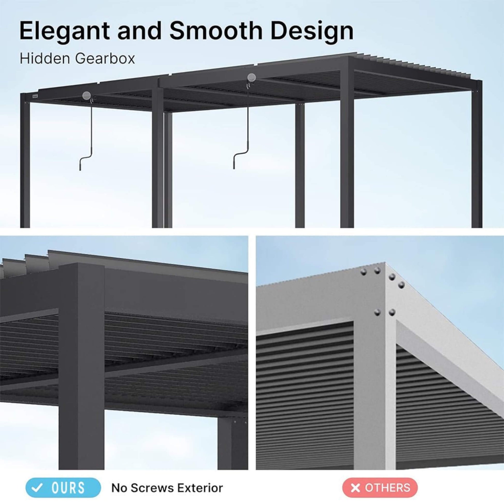 100% Aluminum = 0% Rust. Unlike steel-hybrid pergolas that can eventually succumb to corrosion, The Vantage is constructed entirely from High-Grade Premium Aluminum. This makes the structure lighter, stronger, and completely impervious to rust, ensuring it remains a pristine centerpiece of your backyard for decades.