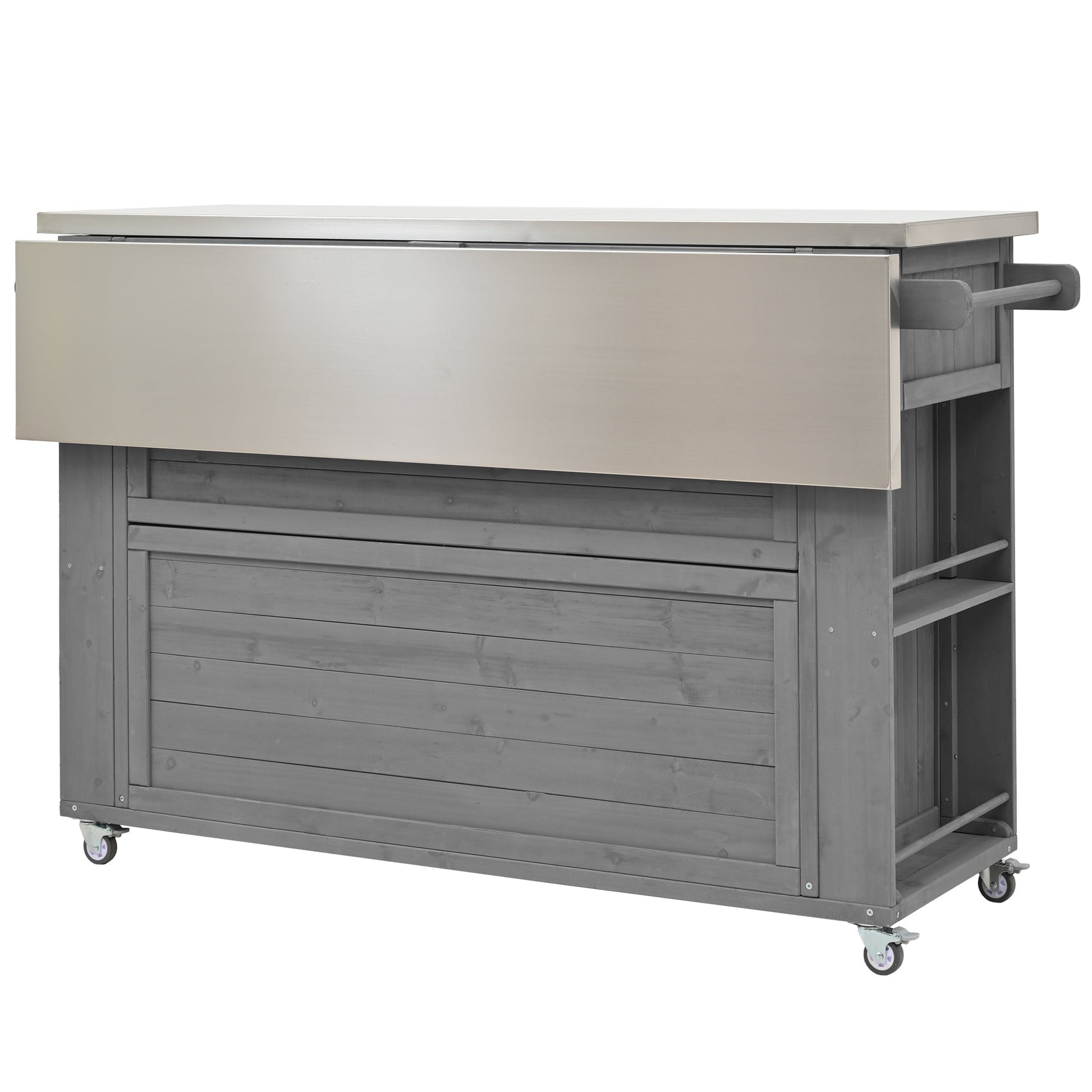 Outdoor Kitchen Island Fir Wood Kitchen Island with Stainless Steel Top, Ample Storage, Towel and Spice Racks, Bottle Opener, Grey